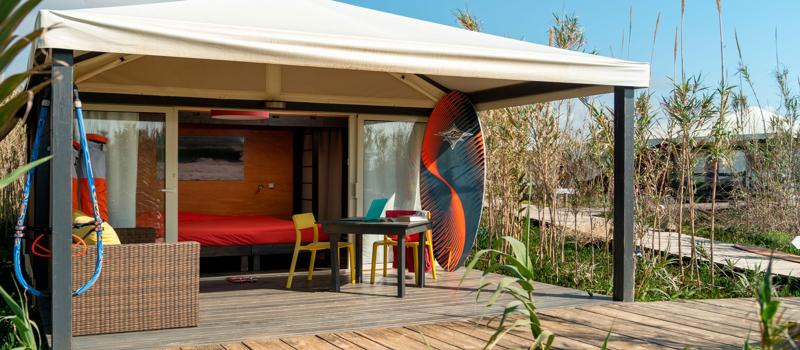 La Tenda Suite, una luxury tent di 40 m² che può ospitare fino a 4 persone, offre un’esperienza unica che richiama la vita a bordo di una barca a vela. L’ampia zona notte con letto matrimoniale o singoli è separata da una piccola parete dal soggiorno, dove due comodi divani si trasformano in letti aggiuntivi. L’angolo cucina, completamente attrezzato, vi permette di preparare romantiche cene da gustare nella quiete della tenda, immersi in un’atmosfera suggestiva.