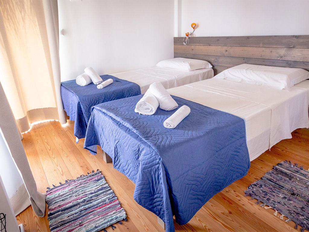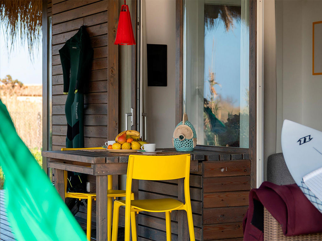 Outside, you'll find a spacious area with sofas, tables, chairs, and hammocks—the perfect setting to sip a drink and unwind after a day of sun, sea, and sports.